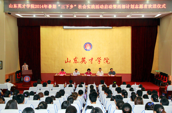 7月4日中午,由校团委举办的山东英才学院2014年暑期“三下乡”社会实践活动启动暨西部计划志愿者欢送仪式在南校区学术报告厅隆重举行,学院董事长杨文教授,副院长李崇银教授,学生工作部部长、团委书记龙新良,学生工作部副部长李寿杰,副部长韩芳丽出席本次会议。二级学院行政副院长、基层团委书记和辅导员老师同时参会,为参加2014年暑期社会实践活动的同学和即将奔赴祖国西部的西部计划志愿者送行。