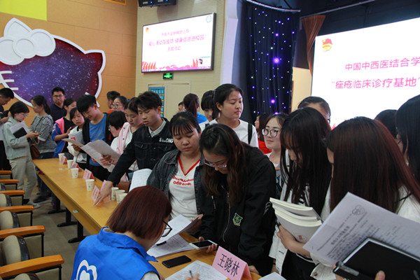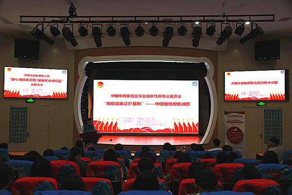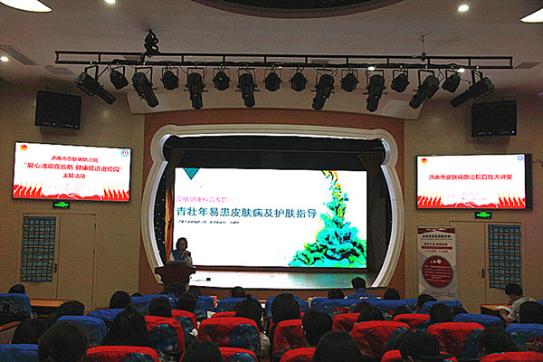 皮肤性病科主任、副主任医师史克实以“荨麻疹的诊治”为主题从荨麻疹的种类、病因、发病机制以及如何鉴别、诊断和治疗等方面为同学们进行了介绍。医学美容科主任、痤疮临床诊疗基地负责人王晓林从“青壮年皮肤特点”、“青壮年易患皮肤病”、“不得不说的痤疮”以及“青壮年护肤指导”四个方面为同学们作了精彩的讲解。